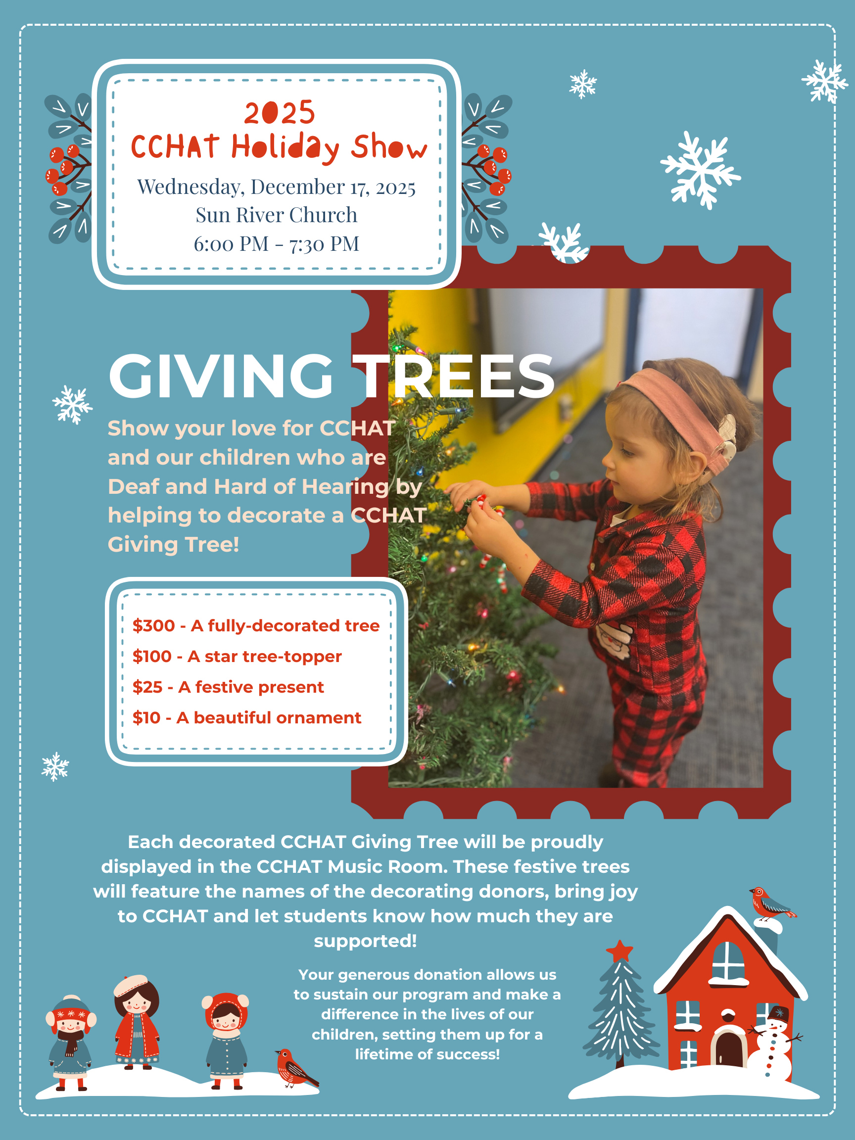 Show your love for CCHAT and our children who are Deaf and Hard of Hearing by helping to decorate a CCHAT Giving Tree! Each decorated CCHAT Giving Tree will be